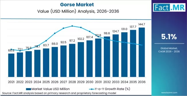 ROCKVILLE, MD, UNITED STATES, March 18, 2026 /EINPresswire.com/ -- For decades, Gorse (Ulex europaeus) has been classified primarily as a stubborn, invasive species, notorious for its rapid spread across the hillsides of Western Europe and New Zealand. However, a significant industrial pivot is transforming this "nuisance" plant into a strategic asset. According to a new comprehensive analysis by Fact.MR, the global Gorse Market is projected to grow from US$ 88 million in 2026 to a substantial US$ 140 million by 2036.